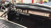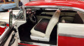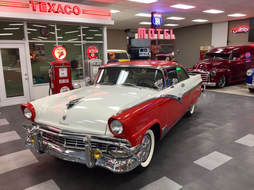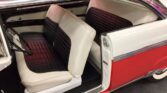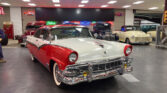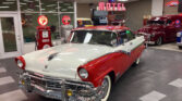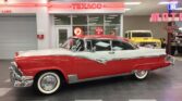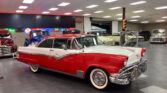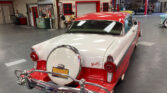 1956 Ford Fairlane Victoria 2 Door Hardtop – Powered by a 292 V8 with a 4-barrel carb, paired with an automatic transmission. Features include a classic red and white exterior, black and white interior, air conditioning, power steering, AM/FM/AUX radio, and tinted windows. Equipped with electric wipers, dual master cylinder, Petronix electronic ignition, fog lights, and a Continental kit. Additional touches include fender skirts, wide white radial tires, and front/rear cattle bars for a standout look.